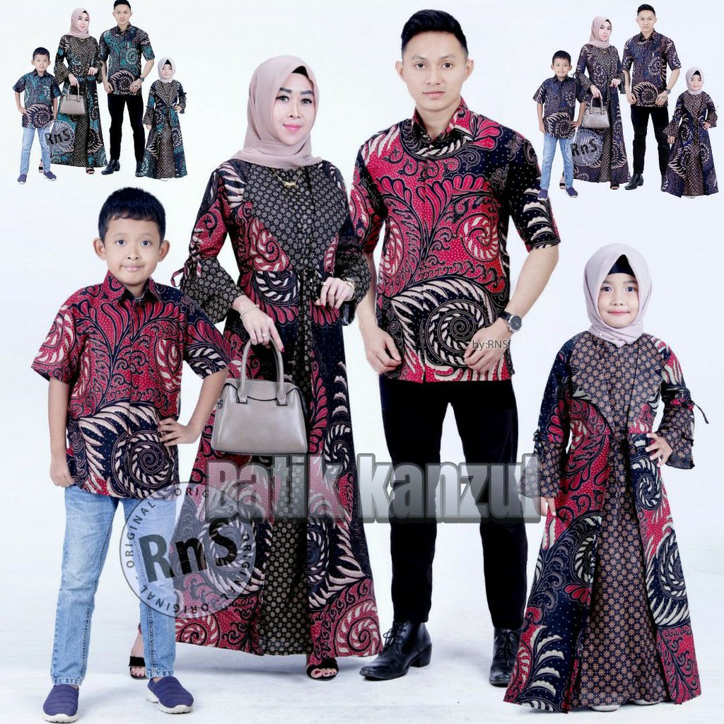 Model : Couple Batik Keluarga yang terdiri dari gamis ibu,gamis anak, kemeja lengan pendek anak, dan kemeja lengan pendek ayah.