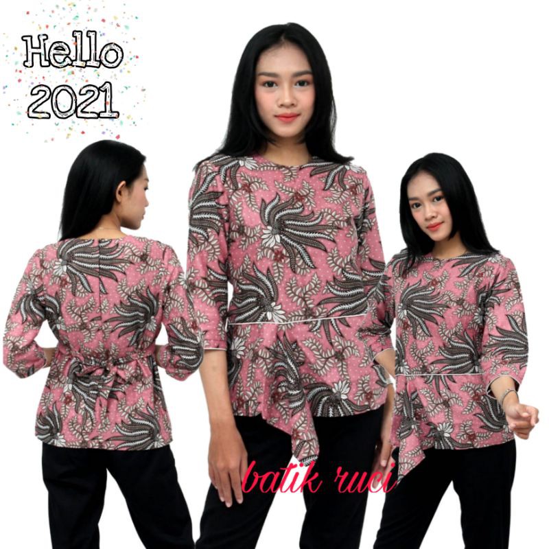 Produsen Pakaian W di Kabupaten Halmahera Selatan Batik Wanita Atasan Blouse Moderl Peplum Warna Pink Size S-m-l-xl-xxl-3l-4l-5l dari Batik Sri Enggawati Kota Pekalongan