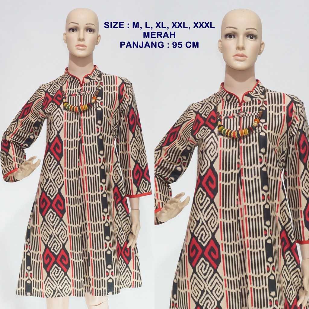 Tunik Batik Wanita Motif Tenun DSC05610 dengan warna merah, coklat dan orange harga murah menggunakan bahan katun prima. Tunik/dress batik lengan panjang 50 cm - 52 cm cocok untuk digunakan saat santai ataupun untuk baju kerja di kantor.